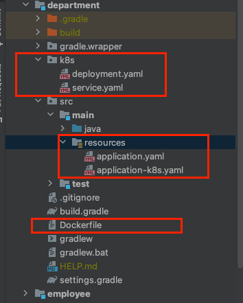 전체 코드 구조는 다음과 같이 서비스마다 Dockerfile과 매니페스트를 저장하는 k8s 폴더가 추가되고, 또한 프로파일을 분리하기 위해 설정파일 또한 추가됩니다.