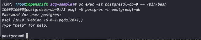다음과 같이 정상적으로 headless 서비스를 통해 Postgres에 접근할 수 있는지 확인합니다. 옵션 중 -h postgresql-db는