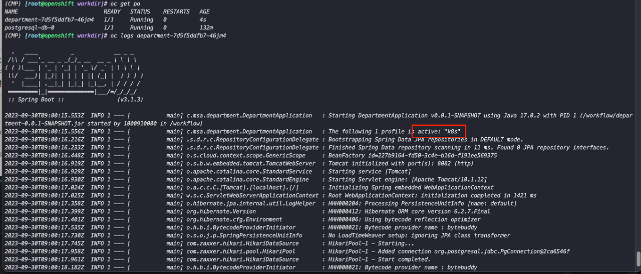 이후 쿠버네티스에 배포한 후 로그를 확인하면 정상적으로 배포되었고 프로파일 또한 k8s로 실행된 것을 확인할 수 있습니다. 동일한 방법으로 employee 또한 배포합니다.