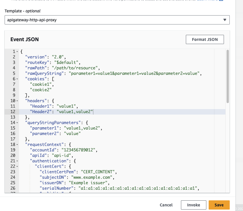 해당 정보외에도 다양한 데이터가 존재하는데 이는 Test event를 통해 확인할 수 있습니다. 다음과 같이 새로운 테스트 이벤트를 생성한 후 템플릿에서 apigateway-http-api-proxy를 선택하면, 아래와 같이 event의 데이터 구조를 확인할 수 있습니다. 실제 테스트 실행 시 API Gateway에서 HTTP Request를 전송하는 형태로 테스트를 진행할 수 있습니다.