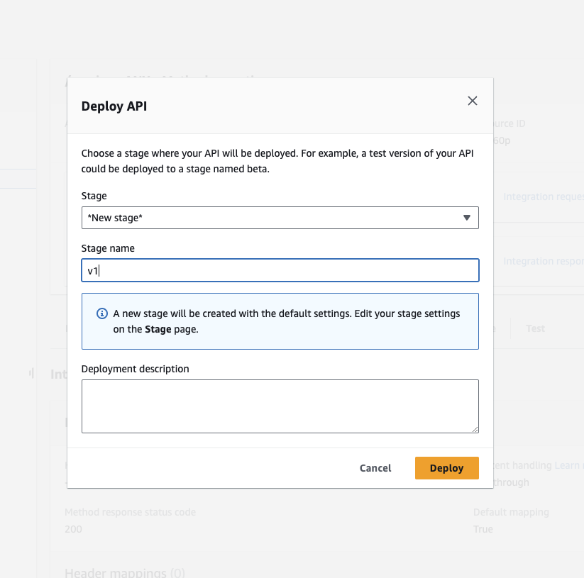이후 API 배포를 위해 Deploy API를 클릭 후 stage 명을 입력합니다. 해당 이름은 URL 경로 처음에 포함됩니다.