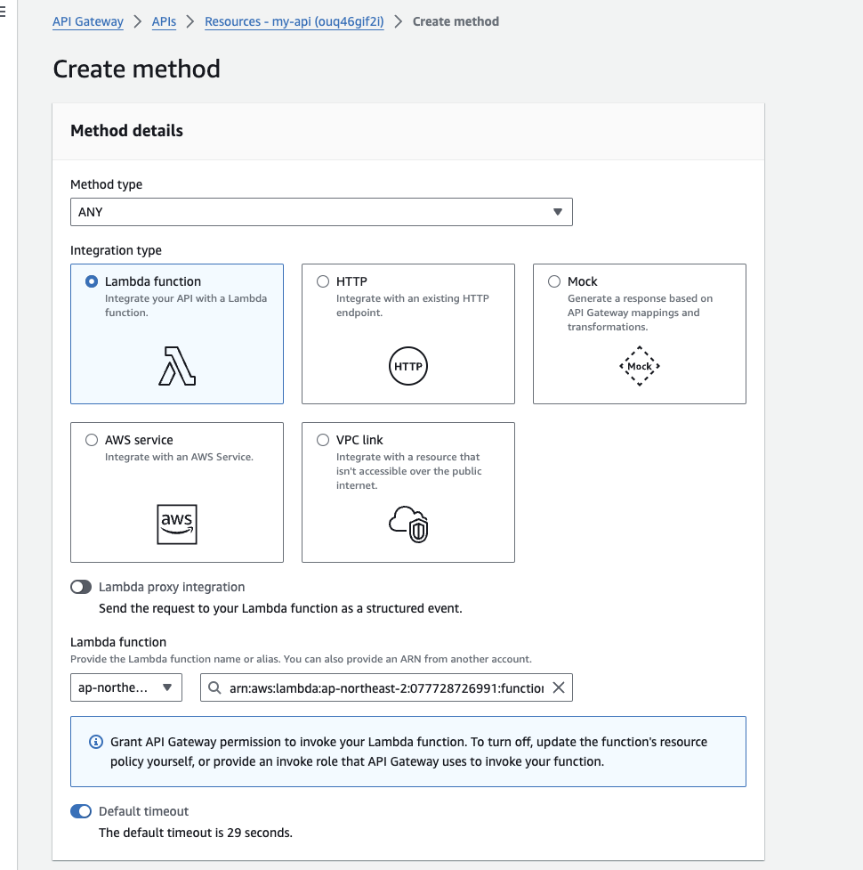 이후 Create Method를 클릭하여 메소드를 생성하여, 어떠한 HTTP Method에 동작할지 선택한 후 생성한 람다 함수를 연결합니다.