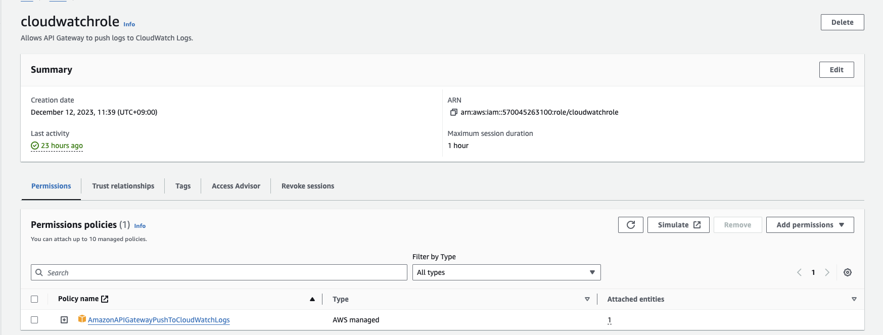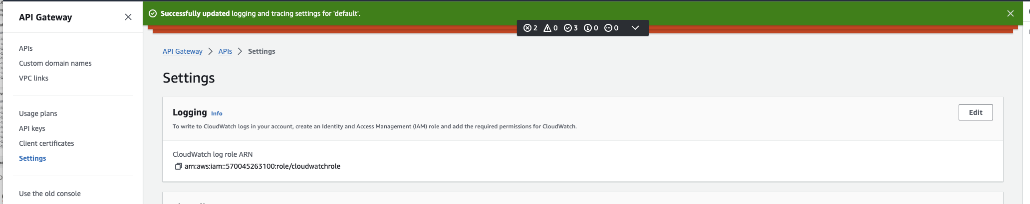 저는 AmazonAPIGatewayPushToCloudWatchLogs 폴리시를 추가해 주었는데, 해당 권한은 로그에 대해 Read/Write/List 권한이 부여됩니다. 생성 후 API Gateway console에서 Setting에 접속해 생성한 role을 연결합니다.