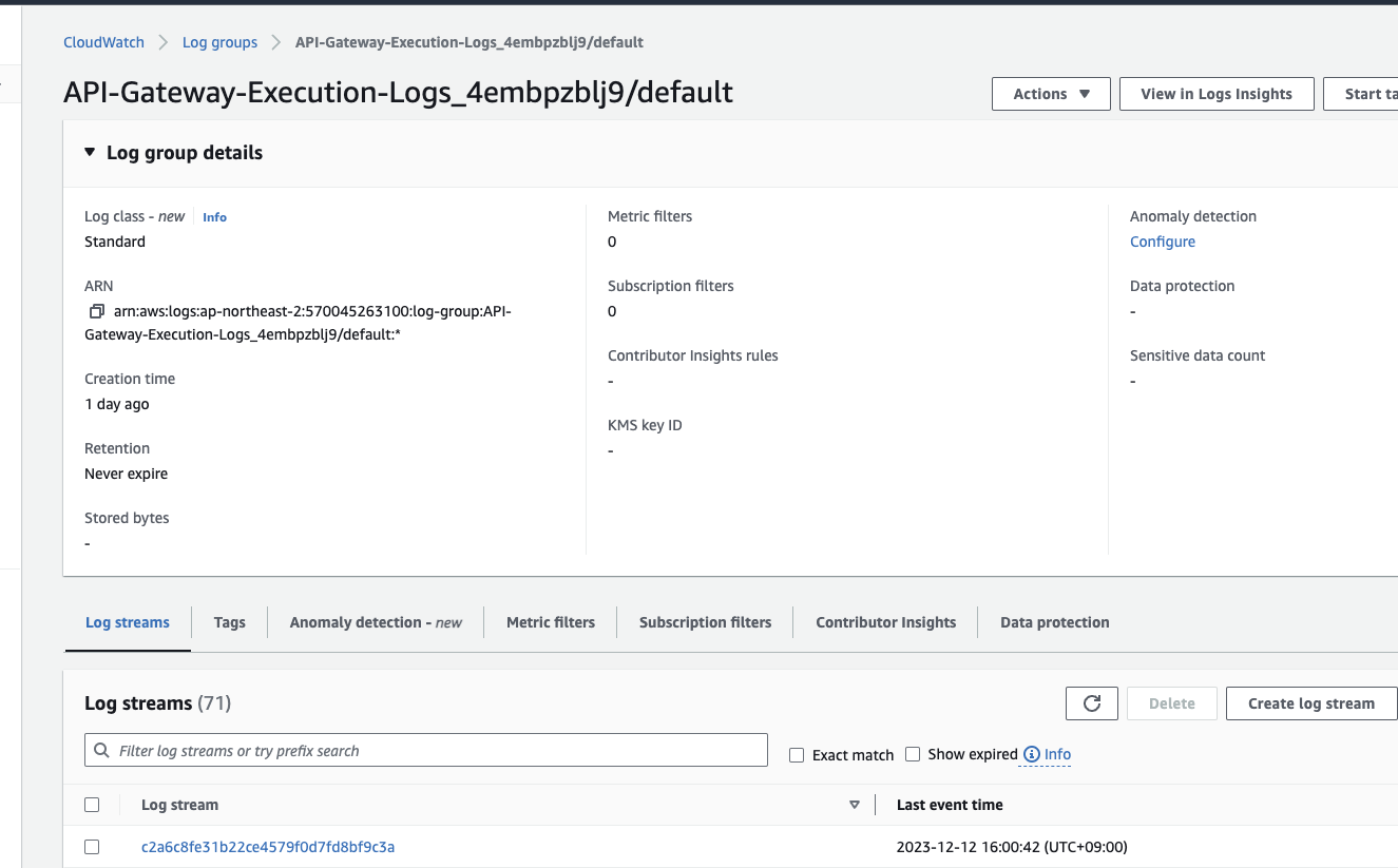 이후 CloudWatch 접속 시 다음과 같이 APIGateway에 대한 로그 그룹이 생기고 로그를 확인할 수 있습니다.