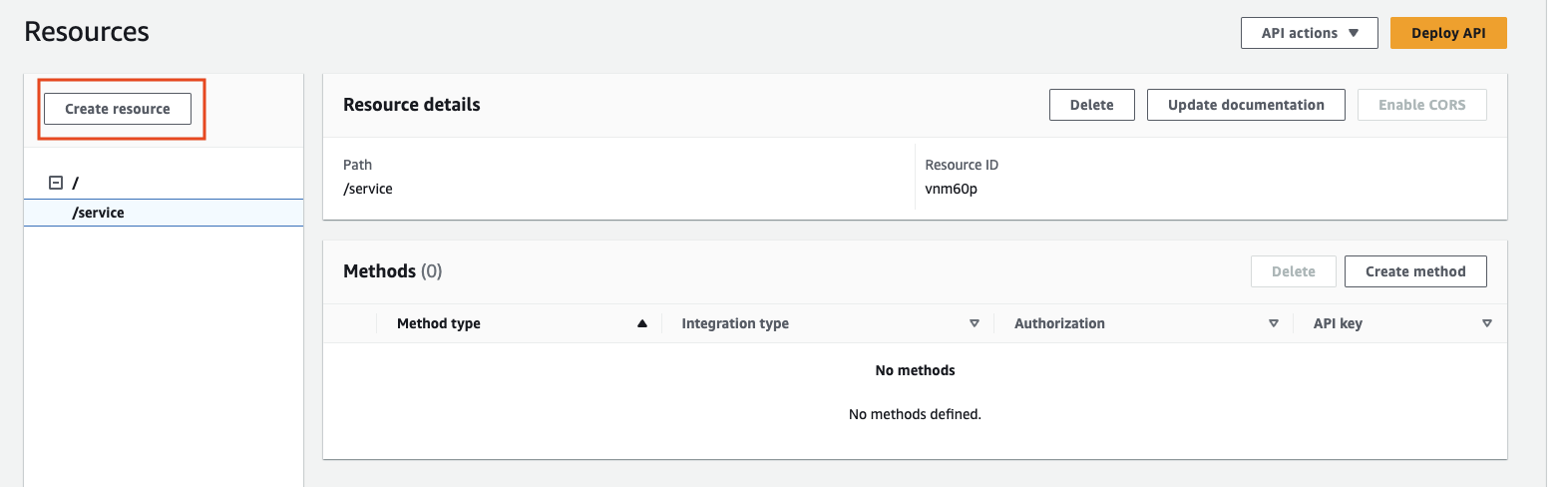 저는 REST 타입을 사용하여 API Gateway를 생성합니다. 이후 각 경로마다 다르게 동작 할 함수를 정의하기 위해 Resource를 생성합니다. 저는 service 이름의 리소스를 생성하였습니다. 이후 해당 경로로 요청 시 어떠한 동작을 할 것인지 Method를 생성해야 합니다.