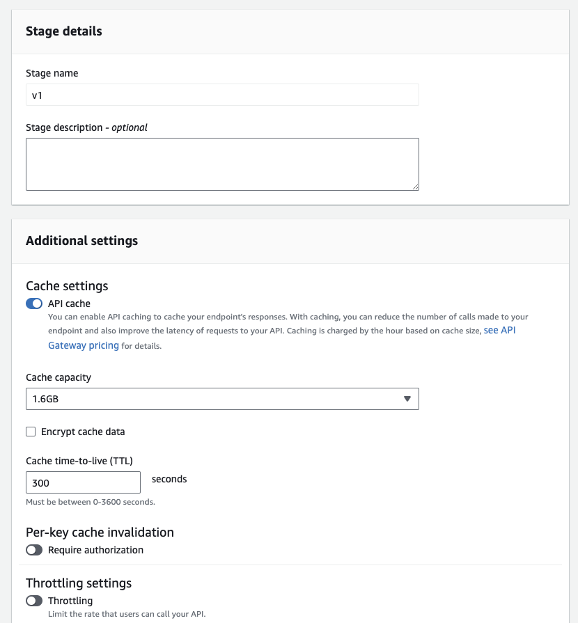 API Gateway에서 response에 대한 캐싱 기능을 제공합니다. 이를 통해 응답속도를 보다 빠르게 설정할 수 있습니다. Cache의 사이즈, TTL 설정을 진행합니다. 크기가 크고, TTL이 길게 설정할수록 성능을 좋아지지만 그만큼 비용도 늘어남으로 적절한 설정이 필요합니다.