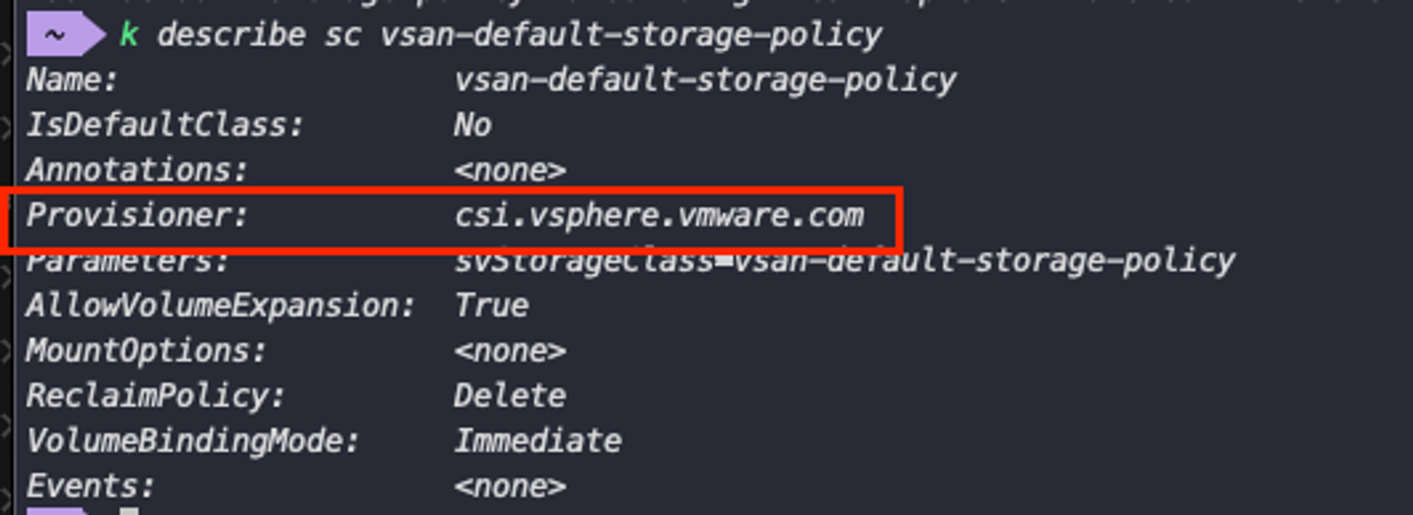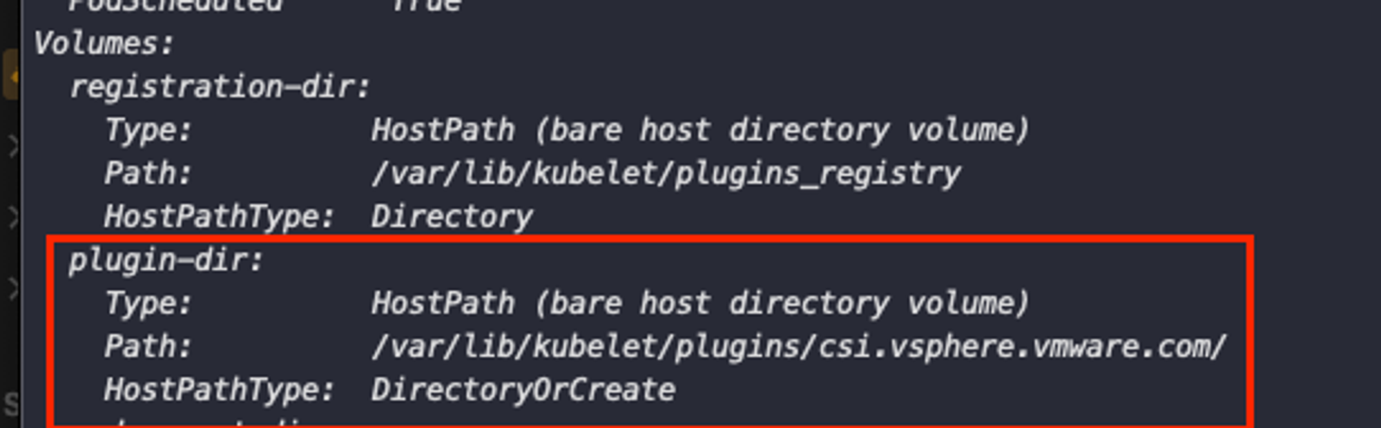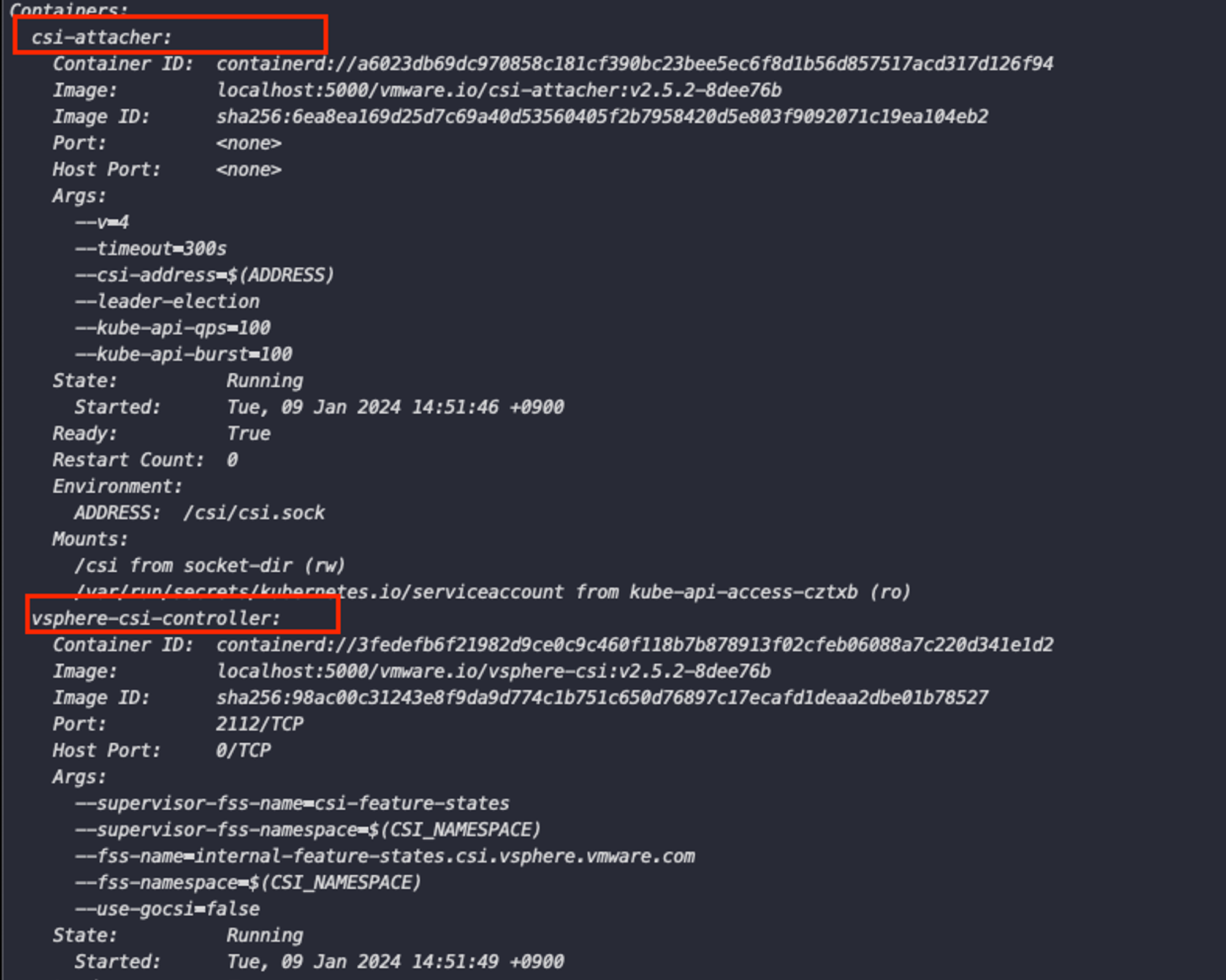 Controller 파드를 살펴보면 여러개의 컨테이터로 구성되어 있습니다. 그 중 한 개(컨트롤러이름의 컨테이너)에는 특정 스토리지 시스템의 CSI Driver가 존재하여 해당 스토리지 시스템과 통신 당담하며, 이를 통해 쿠버네티스와 통합하여, 생성, 마운트, 원마운트 등의 작업을 수행합니다(아래 그림의 vsphere-csi-controller
